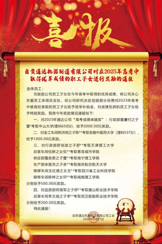 金秋送爽启新程,助学筑梦暖人心。 十年寒窗迎捷报,一生韶华正可期!随着2025年全国高考录取工作圆满落幕,自贡通达机器制造有限公司(以下简称“自贡通达”)的员工子女们也捷报频传,收获了辛勤耕耘的硕果。
