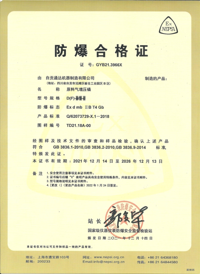 L/D/XD/M系列往复活塞式压缩机防爆合格证