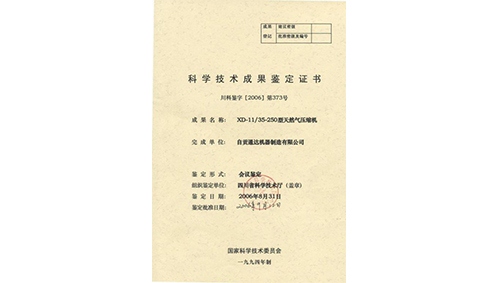 科学技术成果鉴定证书(XD-11/35-250型天然气压缩机)