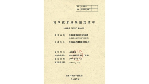 科学技术成果鉴定证书(大排量高性能CNG压缩机)