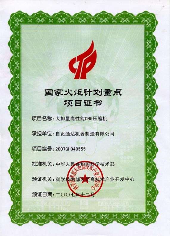 国家火炬计划重点项目证书(大排量高性能CNG压缩机)