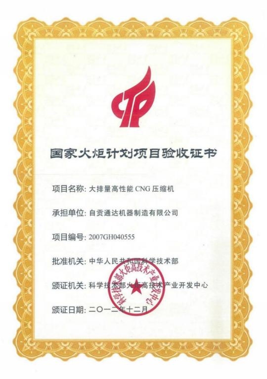 国家火炬计划重点项目验收证书(大排量高性能CNG压缩机)