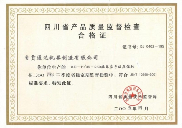 科学技术成果鉴定证书(XD-11/35-250型天然气压缩机)