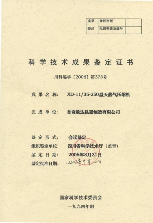 科学技术成果鉴定证书(XD-11/35-250型天然气压缩机)